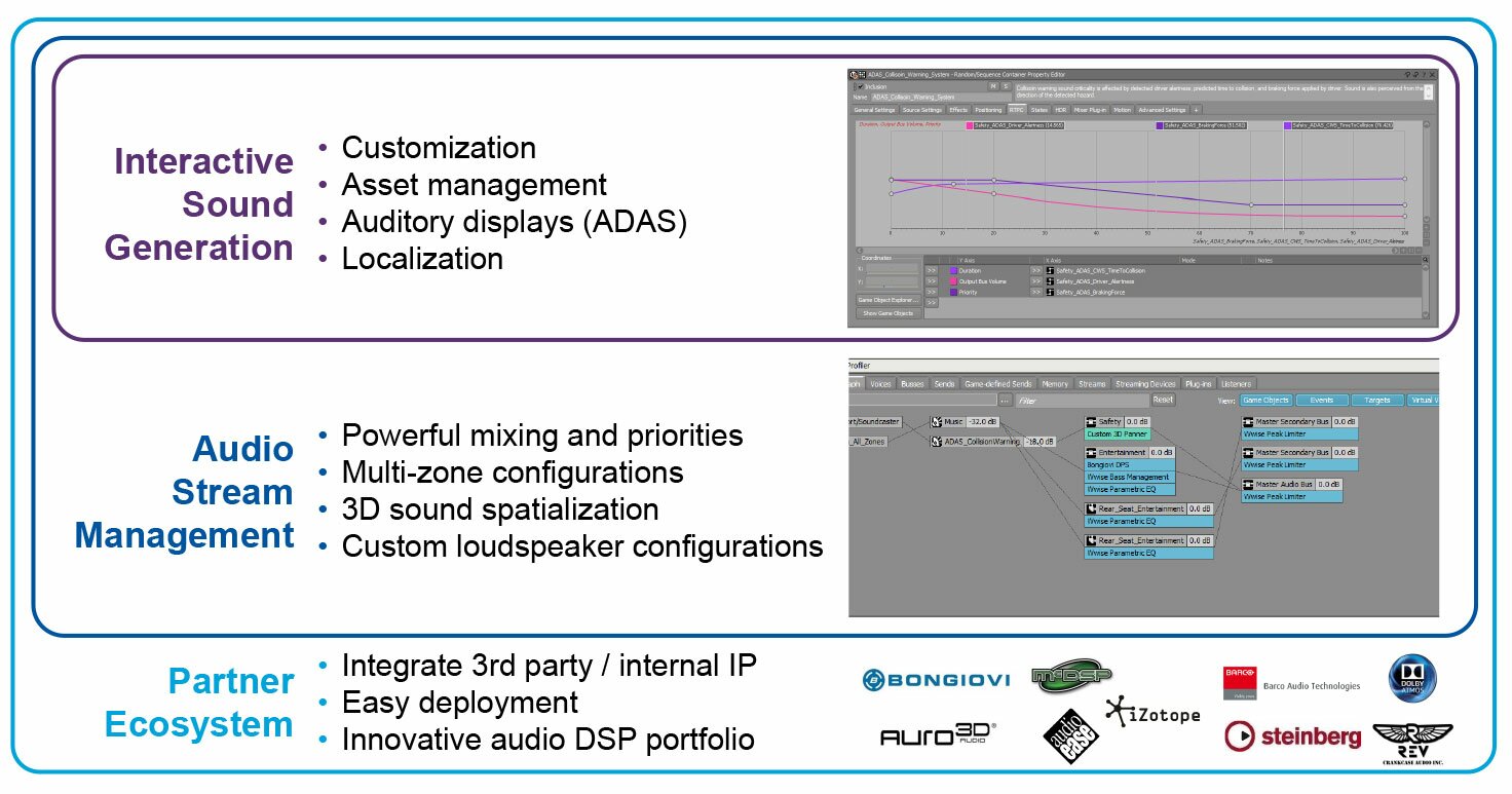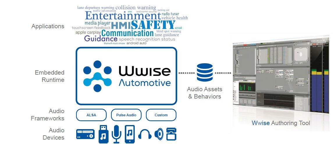 Wwise Automotive is a comprehensive data- driven audio solution. It features an optimized run- time sound engine and an audio authoring application designed to create and manage customized in-car audio experiences.